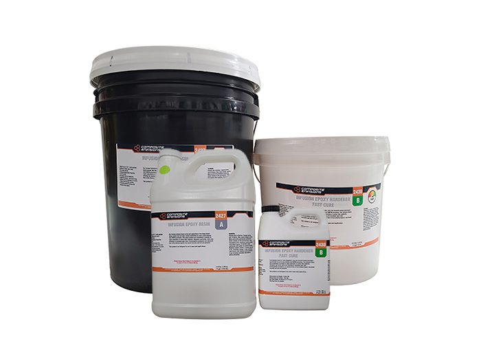 Composite Envisions Infusion Epoxy is the next generation of our house brand epoxy system that has been custom formulated for use in resin infusion and VARTM processes to provide rapid saturation of carbon fiber, fiberglass and Kevlar laminates. Processability parameters are enhanced due to the infusion epoxies low mixed viscosity and wet-out potential while also allowing for maximum open time. Improving on an already great formula this infusion epoxy has added benefits such as extensive testing and enhanced physical properties. One notable property is the increased Heat Deflection Temperatures noted in each of our hardener selections.