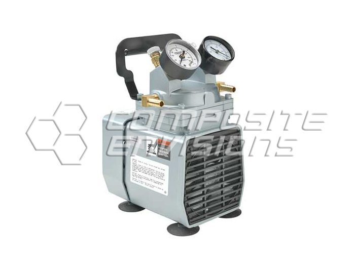 This unit can be used as a compressor or a vacuum pump. This premium Gast pump is a step above our starter pump that comes in the beginner kits. Our Gast line of pumps are made to withstand the high stresses of continual use and are also oil-less which has no smoke and requires minimal maintenance. If you are serious about vacuum bagging/infusion and will be working on projects regularly, we would suggest one of our two premium Gast pumps. The construction on these compressor pumps make them more durable for longer service life. They are permanently lubricated, made from corrosion-resistant materials, and have maintenance-free bearings. Internal sound suppression material lowers the operating noise, making these units suitable for noise-sensitive environments, such as laboratories and medical facilities.