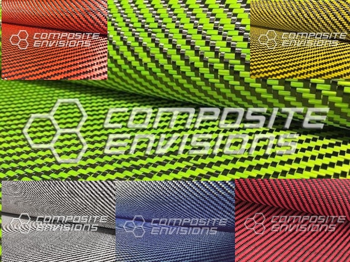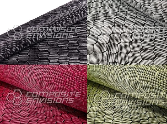 Hybrid and specialty carbon fabrics combine performance with standout cosmetics. Choose carbon/Kevlar® (various colors), carbon/fiberglass dyed (various colors), carbon/Innegra, forged chopped-tow, and patterned weaves (honeycomb, checkerboard, camo), plus functional options like Lightning Strike and silver-metallized. Mirage and Reflections® lines add vivid or light-responsive effects. Available mainly in 2×2 twill and plain weaves across popular gsm ranges, these fabrics wet out easily in vacuum bagging or infusion processes—ideal for visible parts but also for strength, impact resistance, or conductivity.